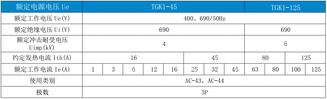 TGK1 系列控制与保护开关电器(CPS)( 以下简称“开关”),主要适用于交流50Hz(或60Hz)、额定工作电压690V、额定工作电流 1A 至 125A、控制器整定电流 0.4A 至 125A、控制电机功率 0.12kW至 55kW 的电路中,能够接通、承载和分断正常条件下 ( 包括规定的过载条件 ) 的电流,也能接通、承载一定时间和分断规定的非正常条件下 ( 如短路 ) 的电流。符合标准:IEC60947-6- 2、IEC60947-6- 2